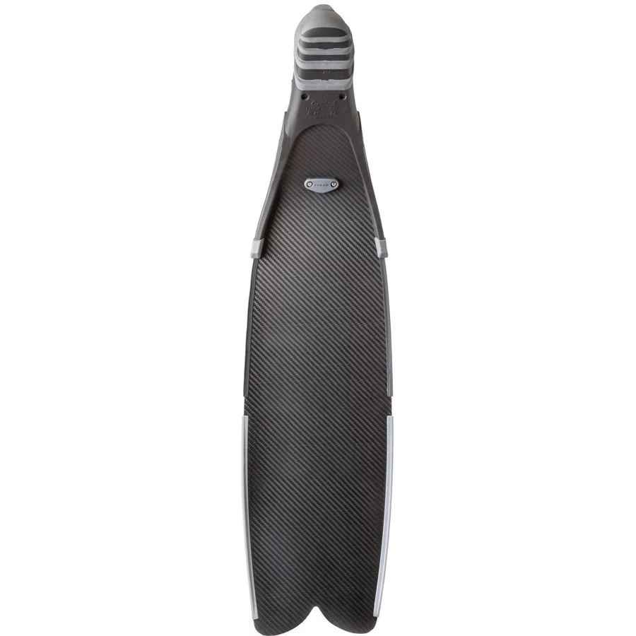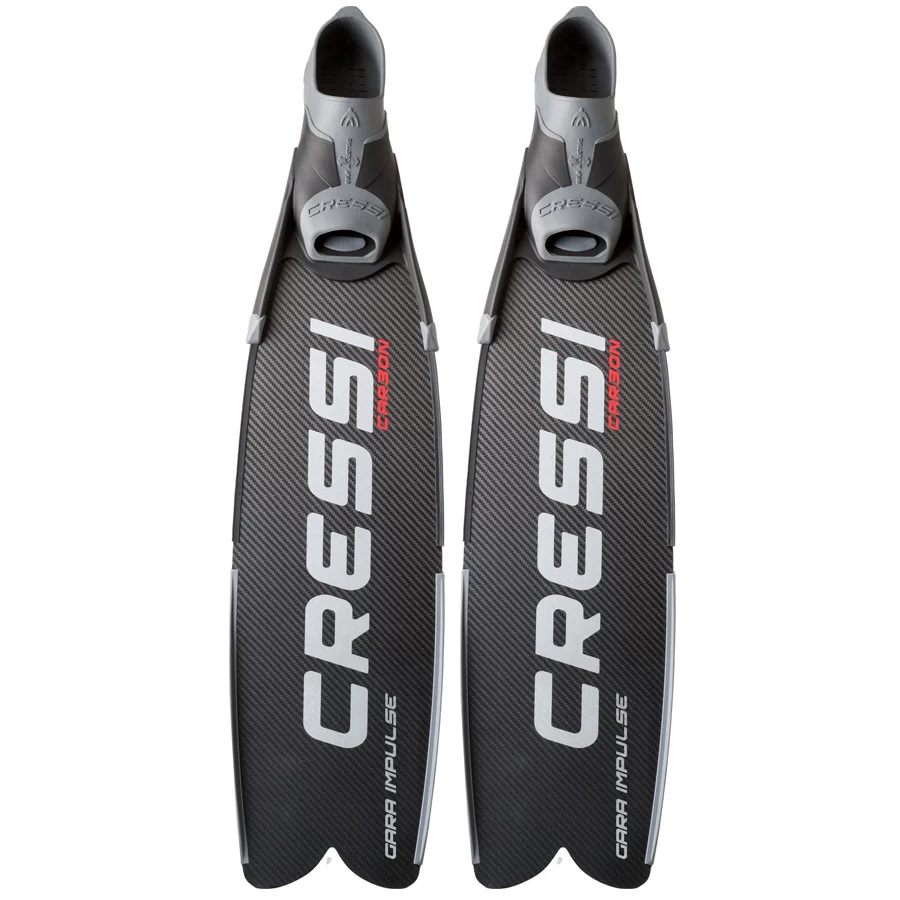 Depuis le projet impulse nous avons réussi à transmettre les mêmes paramètres de projection sur cette nouvelle voilure innovante en carbone, c’est-à-dire la déformation ondulatoire en s. Ce mouvement particulier permet une accumulation notoire d’énergie élastique de la voilure, qui transmise directement à la jambe se transforme en force de poussée. L’effet ainsi obtenu l’a été grâce à un programme de calculs définis qui a permis d’exploiter au maximum les prestations offertes par la voilure carbone. La voilure est fabriquée avec 100% de carbone, et avec un angle de 29°. La voilure est importée du japon, produite par Mitsubishi avec des protocoles de fabrication très strictes, elle est ensuite façonnée et traitée dans un laboratoire spécialisé en Turquie. La voilure est ensuite finalisée avec un processus industriel de double injection réalisé à Gênes au sein des établissements cressi. Cette haute adhérence chimique obtenue entre la voilure et les longerons ont permis une adhésion parfaite sans utilisation de colle, qui ne permettrait pas à la voilure carbone de fléchir naturellement. La gomme thermoplastique utilisée pour les longerons est extrêmement flexible et souple afin de ne pas nuire aux caractéristiques intrinsèques du carbone. La voilure ainsi fabriquée est moins fragile et mieux protégée par la gomme. Le résultat final est une palme très légère, qui réussit à reproduire une flexion maximum du carbone sur chaque millimètre carré